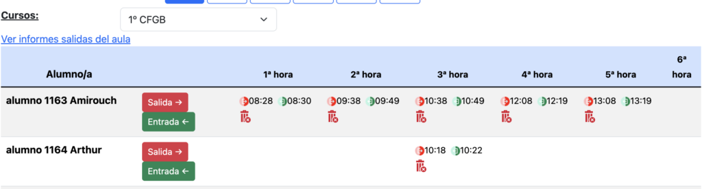 En esta imagen, podemos ver que el primer alumno de la lista, ha salido del aula en 5 ocasiones y siempre en los últimos 15 minutos de la hora, y ha salido más de 10 minutos, volviendo ya casi al terminar la clase. También vemos que el segundo alumno de la lista, sólo ha salido en una ocasión durante toda la mañana y sólo 3 minutos que es lo más lógico. Lo que quiere decir, que el primer alumno pide al profesor salir siempre para escaquearse de la clase y se va a fumar o encontrarse o algún otro amigo en los servicios y malgastar tiempo de clase.