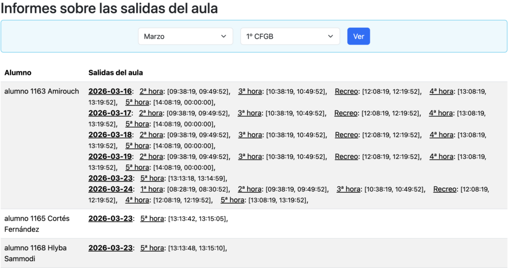 En la siguiente imagen mostramos un informe mensual para un curso de 1º de ciclo básico, y se puede ver que el primer alumno lleva saliendo casi todos los días a la misma hora, y en todos los tramos horarios de clase, por lo que se puede identificar claramente aquellos alumnos escaqueadores.