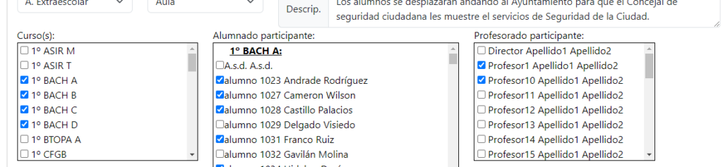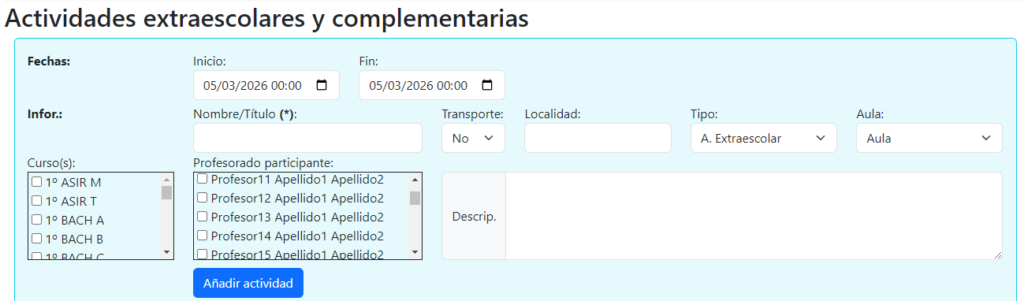 Una vez aquí, al profesor que quiera añadir una actividad, le aparecerá un formulario con los datos necesarios para añadir su actividad extraescolar o complementaria: Nombre de la actividad, fechas de inicio y fin, tipo de actividad, cursos y profesores involucrados, una breve descripción para la ficha de la actividad,…