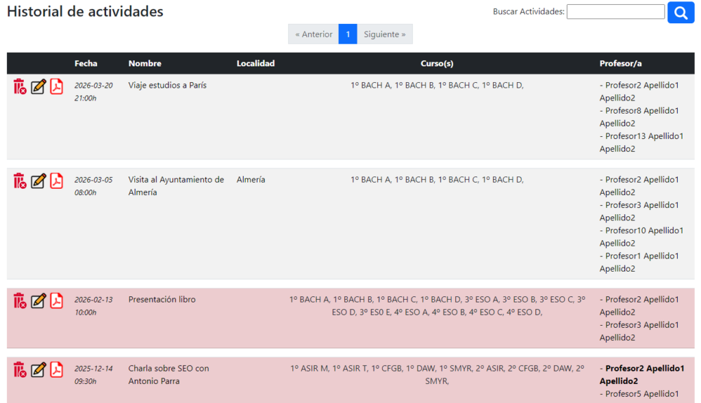 Una vez se añada la actividad a la Base de datos, se creará un histórico de actividades en el que aparecerá una pequeña información, y las actividades que se hayan completado aparecerá en rojo, para diferenciar visualmente cada actividad. Cuando se crea la entrada y se seleccionan los grupos de clase que participarán, en principio se cuenta con todo el alumnado, pero se puede editar y en caso de que haya alumnos que no vayan, se podrá desmarcar a los alumnos que se deseen.